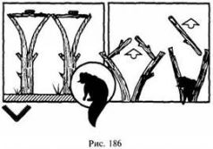 Рожон на волка представляет из себя небольшое, толщиной 12—15 см, расщепленное с высоты 1 м от земли до вершины деревце. На высоте 1,5 м расщеп, чтобы не расходиться дальше, фиксируется с помощью деревянного, проволочного или веревочного кольца. Затем вершины горбылин разводятся в стороны на 1 м и привязываются к веткам деревьев, между которыми рожон устанавливается. Приманку надевают с таким расчетом, чтобы подпрыгнувший зверь попал лапой в расщелину, защемился в ней и повис (рис. 185).
