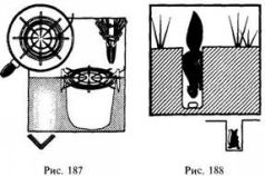 В отличие от крупных ловчих ям, рассчитанных на добычу копытных животных, маленькие, предназначенные для промысла мелких животных, более доступны потерпевшим бедствие, потому что не требуют грандиозных земляных работ. Они представляют из себя узкие, диаметром 15—25 см, вертикальные колодцы, вырытые в плотном грунте на глубину 50—70 см. На дне ловушек рассыпается приманка. Зверек, привлеченный приманкой, забирается в узкую щелевидную яму и застревает в ней. Охотнику остается только прийти и вытащить его за хвост. Неудобство таких ловушек состоит в том, что они адресны, то есть охотнику необходимо заранее знать, на кого он охотится, чтобы диаметр ловушки соответствовал размеру дичи. Для устранения этого недостатка можно попытаться вырыть рядом несколько ям-ловушек разного диаметра (рис. 188).