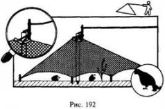 Шатер представляет из себя круглую либо квадратную сеть, края которой привязаны к кольям, вбитым в землю. Середина сети поднимается вверх по центральной жерди и закрепляется в выемке или любым другим способом. Под шатер разбрасывается или подвязывается на невысокие колышки приманка. Как только птица зайдет под сеть, притаившийся в засаде охотник дергает сторожевую нить. Шатрами чаще всего ловят тетеревов, куропаток и другую крупную лесную птицу (рис. 192).