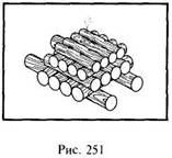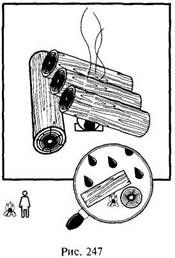 При отсутствии достаточного количества сухих дров для их просушки можно использовать костер-пирамиду. Для этого над ямой, где выложен запальный костер, укладываются срубом расколотые вдоль поленья. Во время сильного дождя такой костер желательно защитить тканевой «крышей» или уложенными сверху плотно пригнанными друг к другу поленьями (рис. 251).
