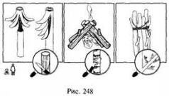 На малых привалах, когда нет времени сооружать капитальные навесы-отражатели, их можно сделать из промокшей верхней одежды, чем совместить приятное – согревание собственных замерзших тел с полезным – просушиванием одежды. Для этого в рукава курток, плащей и пр. пропускается веревка, которая затем растягивается параллельно костровищу за спинами сидящих возле огня людей. Вместо веревки можно использовать длинную жердину, уложенную на сучки близких деревьев, или «плечики» – вбитые в грунт колья, к которым привязаны поперечные палки, просунутые в рукава (рис. 255).