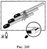 При разжигании костра под дождем или в сильный ветер лучше использовать не одну, а несколько сложенных вместе спичек. Только складывать их лучше уступом, тогда находящиеся на разном расстоянии воспламеняющиеся головки будут загораться последовательно, одна за другой, создавая больший и более продолжительный жар (рис. 249).