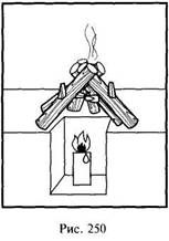 Необходимо следить, чтобы растопка находилась в верхней половине язычка пламени, но не касалась фитиля свечи. Для убыстрения процесса разведения костра можно также накапать на растопку стеарина с горящей свечи (рис. 250).