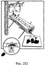 Технические масла можно использовать в качестве топлива в импровизированной печи. Для этого на возвышении устанавливаются или подвешиваются две банки, в которые в пропорции 1:3 заливаются масло и вода. У основания банок пробиваются небольшие отверстия, которые затыкаются пробками (конусообразно обструганными сучками). Масло и вода из разных банок по капле стекают по желобу на металлический лист, в крайнем случае, плоский камень, стоящий на опоре. Под листом (камнем) разводится небольшой запальный костер, который разогревает его. Масловодяная смесь, попадая на раскаленный лист, становится высоколетучей и, воспламеняясь, горит жарким пламенем. Дальнейшее поддержание огня дров не требует (рис. 252).