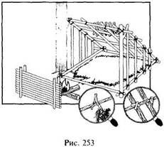 На очень влажной поверхности или на болоте такой настил должен быть более капитальным, например, из бревен, уложенных друг на друга в виде сруба, или поднятым на рогатках (рис. 245).