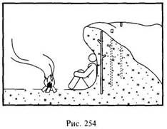 При полном отсутствии материала, пригодного для изготовления навеса, можно вылепить его из снега, для чего воткнуть в сугроб вертикальные палки и нагрести на них 1 -1,5-метровый вал снега. Добившись максимального пламени в костре, следует дождаться, когда снег подтает, снова нагрести снег и снова дать ему подтаять. Постепенно снежный зал приобретет форму своеобразного козырька – ниши. Когда поверхность козырька заледенеет, нужно уменьшить жар костра и оборудовать лежанку (рис. 254).
