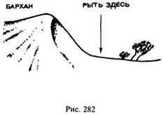 Знатоки пустыни утверждают, что существует возможность добыть воду даже в барханной пустыне. Для этого необходимо в ложбине, у подножия бархана, с подветренной стороны (то есть более крутой, обрывистой), выкопать 1,5-3-метровую ямку. При наличии водоносных горизонтов уже на глубине 1 -1,5 м должен встретиться более темный, влажный песок, внешне похожий на морской. Если работу продолжить, скоро на дне ямы соберется немного грунтовой воды. Считается, что чем выше и оголеннее барханные цепи, чем глубже ложбины между ними, тем больше вероятность встретить воду (рис. 282).