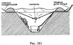 Проще всего этого добиться, соорудив так называемый солнечный конденсатор (рис. 283). Для этого надо вырыть в грунте яму диаметром 0,8-1,0 м и глубиной 50—60 см. На дно поставить емкость, предназначенную для сбора воды. Сверху яму прикрыть куском полиэтиленовой пленки, края которой закрепить, плотно присыпав по периметру слоем песка или земли. В центр пленки, чтобы придать ей конусообразную форму, необходимо уложить камешек. Солнечные лучи, свободно проникая сквозь полиэтилен, «выпаривают» из грунта влагу, которая из-за разности температур в яме и на улице осаждается на пленке. Капли стекают в центр воронки и капают в емкость. Чтобы каждый раз для слива воды не надо было разрушать конденсатор, целесообразно внутрь емкости опустить резиновую или полихлорвиниловую трубку, другой конец которой вывести на поверхность земли. Для увеличения производительности конденсатора внутрь ямы рекомендуется уложить свежесорванные ветки растений. Или даже, простите, помочиться на ее стенки.