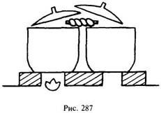 Обыкновенная столовая ложка или примерно такого же размера ветка обматывается вкруговую тряпкой или сухой травой и укладывается на два стоящих рядом котелка, кастрюли или металлические банки. Сверху котелки и палочка накрываются крышками, как показано на рисунке. Под первым котелком разводится слабый огонь, при этом надо стараться, чтобы второй котелок не нагревался. Испаряющаяся вода будет осаждаться на крышках и по ветке стекать во второй котелок. За 3-4 ч работы куба подобным образом можно получить до 1 л дистиллированной воды.