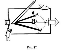 По тени. Чтобы точно определить полуденную тень, надо на ровной площадке под углом в 45—50° вбить в землю полутораметровую палку. К ее вершине привязать веревку, утяжеленную с нижнего конца камнем-отвесом. Под отвесом забить колышек (рис. 17, точка А). За 30—50 мин до наступления местного полудня (запас времени берется на случай неточного хода часов) отмечается конец тени, отбрасываемой палкой (точка Б). С помощью веревочного циркуля, прикрепленного одним концом к колышку (точке А), от точки Б проводится полукруг.