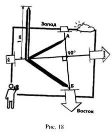 Существует более простой, но менее точный способ определения сторон света (рис. 18). На плоском участке местности надо вбить в землю метровый колышек и отметить конец тени А. Через 15—20 мин сделать вторую отметку конца тени Б. Полученная линия АБ будет расположена в направлении восток – запад. При этом точка первой тени будет показывать западноен аправление, а второй – восточное. Линия, проведенная от основания палки под прямым углом к линии восток – запад, укажет на север. Данный способ наиболее точен в южных районах страны в летний и зимний периоды, менее точен весной и осенью и совершенно непригоден в дни солнцестояния.