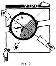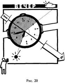 По солнцу и часам. Довольно известен способ определения сторон света по солнцу и часам. Для этого надо, поворачивая часы в горизонтальной плоскости, направить часовую стрелку на солнце. Минутная и секундная стрелки в работе не задействуются, и поэтому на них можно не обращать внимания. Биссектриса угла между часовой стрелкой и цифрой «2» на циферблате укажет направление на юг. Причем до полудня юг будет справа от солнца (рис. 19), а после полудня – слева (рис. 20).