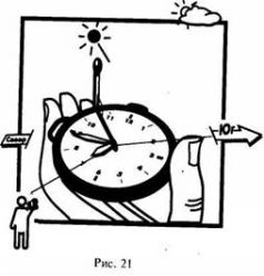 Более точен прием с часами и спичкой. Часам следует придать наклонное положение под углом примерно 40—50° к горизонту, при этом часы надо держать большим и указательным пальцами у цифр «3» и «9», цифрой «12» от себя (рис. 21).