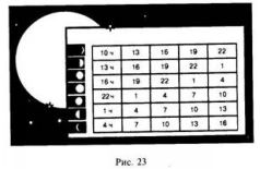 По луне. В ночной период времени помогает сориентироваться луна. Полная луна занимает наиболее высокое положение над горизонтом, когда находится на юге. Иначе говоря, самая короткая полуночная тень при полной луне указывает на север. В таблице (рис. 23) приведена зависимость времени наблюдения фаз луны и сторон света.