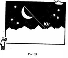 Существует еще один упрощенный способ ориентирования по луне, находящейся в первой или последней своей четверти (то есть когда видна лишь одна четвертая часть диска.) В этом случае надо мысленно соединить концы «рожек» месяца прямой линией и продолжить ее вплоть до пересечения с горизонтом. В Северном полушарии эта точка будет указывать приблизительно на юг. В южном – соответственно на север (рис. 24).