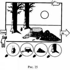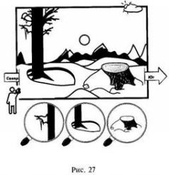 У сосны, у комля, ближе к корням, нередко обильно нарастает мох, лишайники. Мох любит сырость, тень, норовит спрятаться от прямых солнечных лучей за стволом и, значит, указывает на север. Точно так же мох располагается на отдельных камнях, пнях, на скалах, на стенах старых деревянных и каменных строений. Из лиственных деревьев мхом и лишайниками больше всего обрастают осины и тополя. В случаях, когда ствол дерева покрыт разросшимся лишайником вкруговую, надо ощупать его рукой. С северной стороны лишайник более влажный, плотный, его больше. Засохшие деревья, пни, упавшие на землю стволы в большей степени гниют с северной стороны (рис. 25).