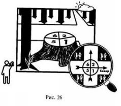 Помочь сориентироваться могут лесные просеки. В больших лесных массивах обычно просеки ориентируются в направлении север – юг и запад – восток. Нумерация кварталов лесных массивов в бывшем СССР идет с запада на восток и далее на юг. Поэтому ребро между двумя наименьшими цифрами обычно указывает на север. Но этот способ требует многократного подтверждения, так как иногда квартальные столбы устанавливаются небрежно или случайно сдвигаются (рис. 26).