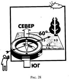 Проще всего избежать бега по кругу тем, кто имеет компас. Достигается это следующим образом. Когда с помощью карты или импровизированного плана местности определено направление движения, надо расположенный горизонтально компас поднести ближе к глазам, совместить поворотом компаса вокруг своей оси северный конец стрелки с нулевой отметкой на шкале и, вращая, установить визирное кольцо возле цифр на шкале, обозначающих курс. Затем, сквозь совмещенные целик и мушку наблюдая местность, заметить в направлении движения какой-нибудь ориентир – скалу, отдельное дерево и пр. (рис. 28).