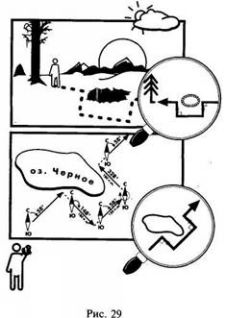 Препятствие, встретившееся на пути по закрытой местности, следует обходить «вслепую», по компасу. Для этого надо взять курс, перпендикулярный к ранее избранному, и пройти некоторое расстояние, подсчитывая при этом шаги. Когда пройденное расстояние будет достаточным для обхода препятствия, надо вернуться на прежний курс. Продолжая подсчет шагов, пройти расстояние, примерно равное длине препятствия, снова сделать поворот на 90°, но уже в другую сторону, то есть к препятствию, и пройти расстояние, равное подсчитанному ранее. В итоге человек вновь окажется на нитке маршрута, но уже по другую сторону от препятствия. Если человек промахнулся и повернул раньше, чем следовало, надо, наткнувшись на препятствие, повторить маневр, то есть развернуться на 90° или вернуться назад, в последнюю точку поворота, и продолжить путь. Чтобы не сбиться в подсчете шагов и поворотах, желательно на ходу вычерчивать небольшой план, где обозначать расстояние и повороты (рис. 29).