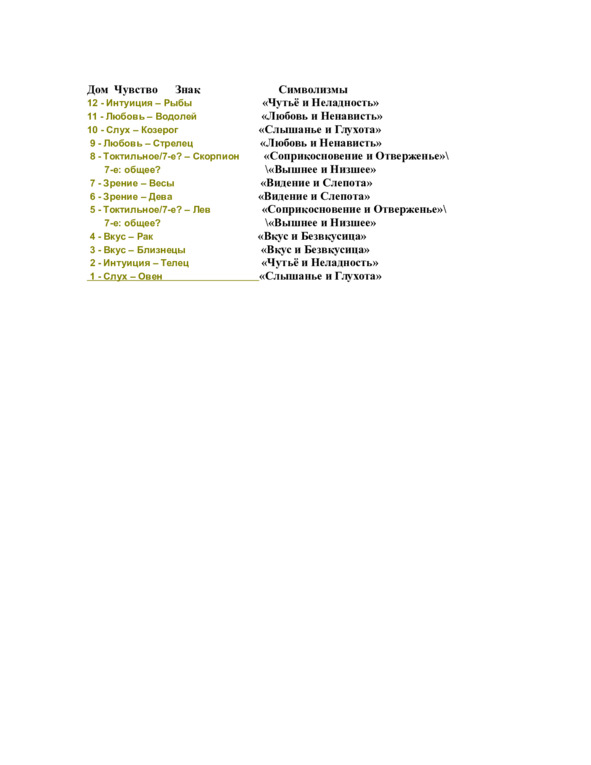 В последовательности Чувств наблюдается знакомая по Психологической 24-ричной прогрессии, другая Чувственная с 6 до 1, называнная нами Энерг-етической. Наши же Чувства от 3 до 7 направлением идут вспять тому процессу очередно. На синхронных им Психиках в последовательности 7—7\8—8- (Вод.-11) -8, крутящийся вокруг одного да около и только это показывающее; необходимо посмотреть и третью синхронизирующуюся последовательность элементов 2. На первых двух шагах их много, а затем ни одного. И то-то при сомнении причастности первых двух из-за непринадлежности к 8. А всё принадлежащее как нарочно ничего не имеет, чтобы достичь отсутствующее 2. И те первые два можно бы было оставить без внимания, если бы у нас не было твёрдоопределённого Экстрасенсорного начала на Видении того на 3 оказавшегося в соседстве с 7-м видом Психики Отношений, всегда и везде так естественно оказывающегося в возможности Магии Видения того, у меня неспроста оказавшегося в наличии причастности. Что же касается Звук-овой ступени, то воспоминается из прошлой Жизненной истории о сне с неким «Волшебным словом», которое забылось тогда же и напоминало собою (интуитивно) студенческую «Альма-Матру». Да и то, что мы знаем из Сказок о волшебничанье, то действительно оно нужно и должно быть.