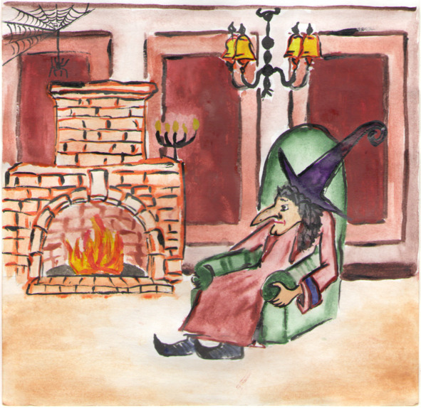 Ребята зашли внутрь. Как только они переступили порог, дверь со скрипом захлопнулась. Посередине комнаты стояло высокое кресло. Оно было повернуто спиной к ребятам. Напротив него горел огонь в камине. Что было странно, так как трубы у дома не было. В кресле кто-то сидел. Ребята не могли видеть, кто же скрывался за спинкой кресла. Из-за спинки торчал лишь кончик длинного носа.