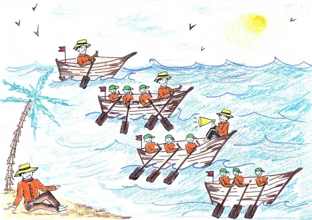 Четвёртая лодка плывёт сама, а капитан загорает под пальмой, наслаждаясь морским прибоем. При этом гребцы трудятся синхронно и с максимальной отдачей. Лодка плывёт заданным курсом по морю Бизнеса прямо к Успеху.