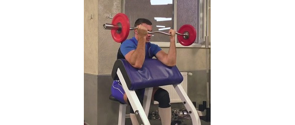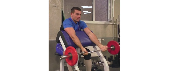 Сесть за тренажер, удерживая штангу хватом снизу, опустить предплечья рук на пюпитр. В исходном положении, руки должны быть выпрямлены в локтях. Плавно согнуть руки в локтях до момента пикового сокращения бицепса и медленно разогнуть их.