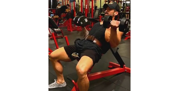3. Сгибания рук с гантелями сидя с использованием наклонной доски в 35 – 45 градусов для опоры спины.