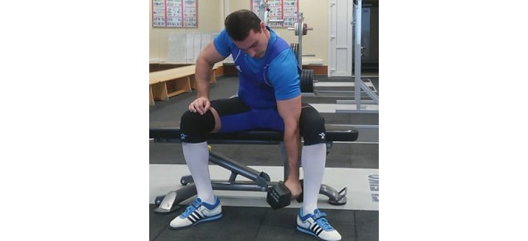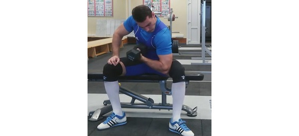 Сидя, удерживающая нижним хватом гантель рука прямая, локоть опирается о внутреннюю поверхность бедра. Плавно согнуть руку в локте, донося гантель до груди, затем, медленно разогнуть.