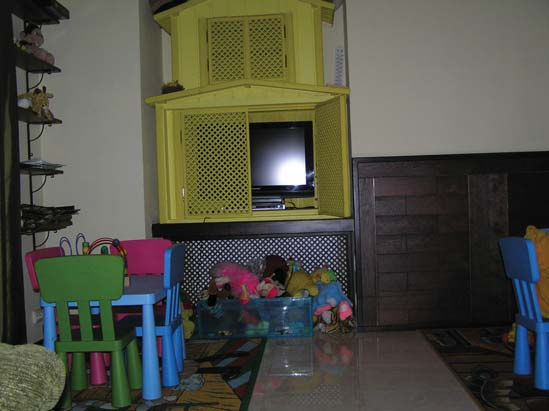 Все получившиеся отсеки закройте дверцами-ставнями с изображением обрешетки и… ваш детский замысловатый уголок готов. Такое расположение телевизора не только экономит место в комнате, но и является сдерживающим фактором для доступа к самому телевизору в ваше отсутствие.