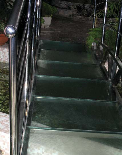 Некоторые, увидев мою конструкцию, сомневаются: не слишком ли хрупкий материал стекло, чтобы из него делать лестницы? Спешу развеять эти сомнения. Сегодня широко распространены пуленепробиваемые стекла и стекла, промышленным способом изготовленные по технологии «мультиплекс». Прототипы «мультиплекса» – лобовые стекла автомобилей, защитные перегородки в кассах банков, и если не убояться и пойти в своих фантазиях дальше, то таким же способом можно изготовить настоящие стеклянные лестницы. Это не очень дешевое стекло, но как раз для тех, кто хочет выделиться, понимает возможности оригинального дизайна в бытовых и жилых помещениях, знает, что «овчинка стоит выделки».