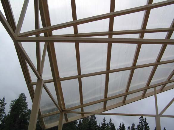 Материал, из которого делают прозрачную кровлю, поликарбонат – в сотни раз прочнее стекла (хотя раз в шесть его легче – при тех же сопоставимых размерах) и в 8 раз прочнее акриловых панелей, что позволяет реально экономить на несущих конструкциях, которые теперь можно делать из легких реек, тем не менее хорошо скрепленных между собой.