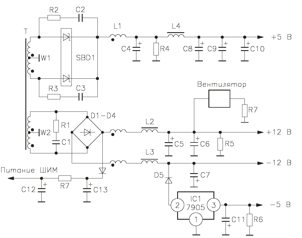 Каждая полная вторичная обмотка состоит из двух полуобмоток. Точка их соединения подключена к общему проводу вторичной цепи питания. Одна вторичная обмотка используется для получения напряжений +5 и -5 В, вторая является источником напряжения для каналов +12 и -12 В.
