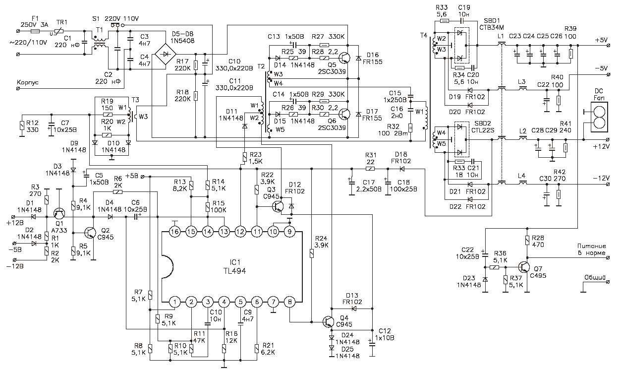 В схемах, где возбуждение популярной микросхемы управления TL494 производится первичным импульсом, напряжение питания этой микросхемы и промежуточного усилителя снимается с выхода выпрямительной схемы канала +12 В. Каскады фильтрации данного напряжения аналогичны приведенным ранее.
