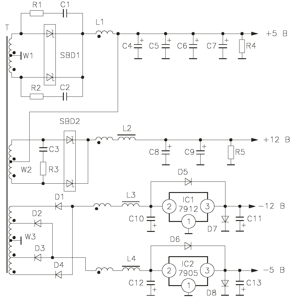 Выводы комбинированной обмотки W3 присоединяются к катодам обычных импульсных выпрямительных диодов D1-D4. Средняя точка обмотки W3 подключена к общему проводу вторичной цепи питания. Диоды D1 и D4 образуют двухполупериодный выпрямитель канала напряжения -12 В.