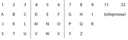Кроме того, в приведенную таблицу добавлены числа 11 и 22, но этим вибрациям не соответствуют какие-либо буквы алфавита. Они рассматриваются как сверхвибрации, принципы или обертоны за пределами вибраций 1–9.