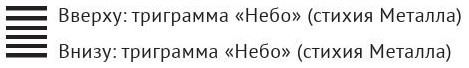 Первая гексаграмма означает Небо, правителя, вождя, лидера, наставника. Отца. Все ее черты – активные, янские, что указывает на движение и большую силу. В китайской философии Небо – источник всего мироздания, аналог Бога-Творца. Человек должен почитать Небо и подражать ему, стараясь постоянно самосовершенствоваться физически, умственно, морально и духовно.