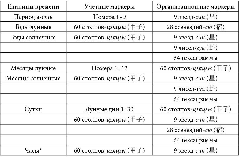 Я решил для наглядности представить основные китайские календарные маркеры в виде таблицы (см. табл. 2). Поскольку мы выяснили, что все они циклические, нас теперь интересует только деление маркеров на учетные и организационные.