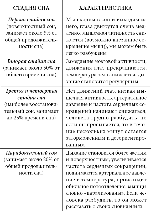 В первой стадии сна нас или клонит ко сну, или же мы дремлем, а перед нами проходят какие-то, как правило, бессвязные («рваные») зрительные образы. В этой же стадии сна у нас могут возникнуть спонтанные, непроизвольные сокращения мышц, вызывающие ощущение, будто бы ты оступился, начал падать или совершил прыжок. Во второй стадии сна температура нашего тела несколько снижается, дыхание становится равномерным, а зрительные образы пропадают. Далее начинается восстанавливающий сон – в третьей и четвертой стадиях сна мы полностью расслаблены. Нас очень трудно разбудить, а если все-таки попытаться, то мы долго будем приходить в себя, ощущать заторможенность и даже некоторую дезориентацию (детский энурез, ночные ужасы и снохождение происходят именно в эти стадии сна). Дальше наступает время парадоксального сна, характеризующегося исключительной активностью нашего организма. Некоторые ученые считают, что в этой фазе происходит интеграция информации, накопленной человеком за день. Впрочем, эту гипотезу подтвердить или опровергнуть достаточно трудно.