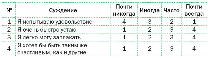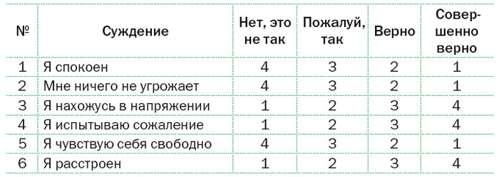 ПЕРВЫЙ ТЕСТ: как я чувствую себя сейчас?Внимательно прочитайте каждое из предложений и обведите цифру в столбце, название которого соответствует вашему состоянию в данный момент: «нет, это не так», «пожалуй, так», «верно», «совершенно верно».