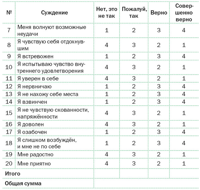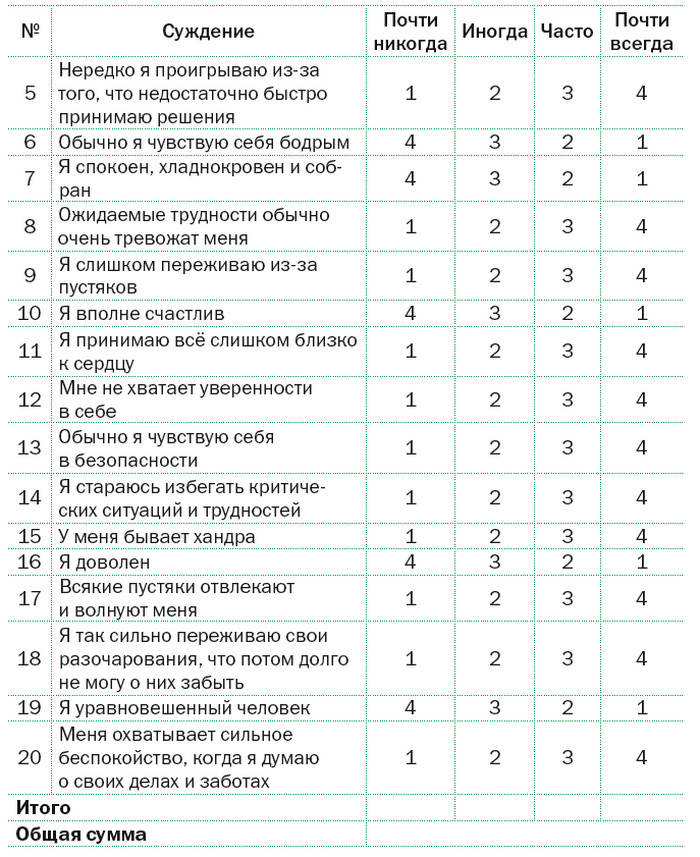 • кроме того, средние, а особенно высокие показатели по этому тесту могут свидетельствовать о том, что вы в принципе тревожный человек, который болезненно, близко к сердцу принимает множество ситуаций (это может быть связано с низкой самооценкой, ощущением собственной несостоятельности, неуспешности, гиперответственностью, сильной зависимостью от того, что могут сказать другие).