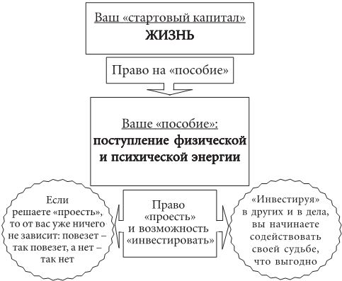 Какой же жизненной энергией мы обладаем? Оказывается, что у нас два источника энергии – один внешний, другой внутренний. Все, конечно, начинается со «стартового капитала», которым является сама наша жизнь, благополучно с щедрого плеча судьбы нам выданная. Но дело этим не закончилось, дальше нас, что называется, «посадили на зарплату». В нас постоянно вырабатывается физическая и психическая энергия, которая позволяет нам жить дальше, то есть поддерживать в себе жизнь и организовывать ее. Желающие могут этим и ограничиться – это действительно очень неплохой куш. Тот же, кто воспринимает как угрозу сакраментальное советское проклятье «Что б тебе всю жизнь жить на одну зарплату!», должен обратиться за «внешними источниками финансирования».