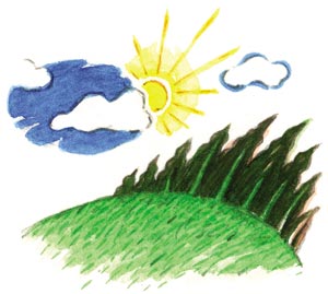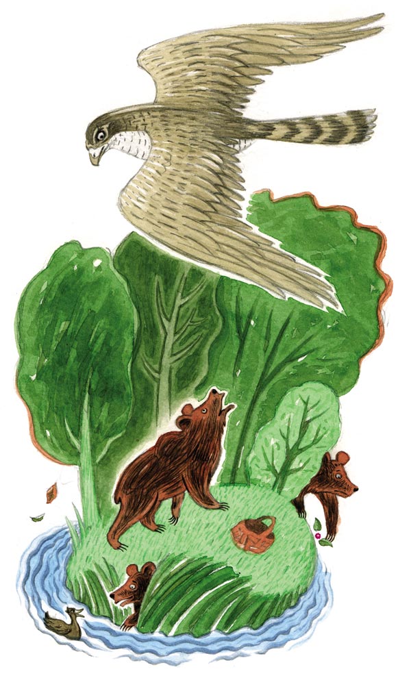 А в небе ястреб парит, высоко-высоко. Закричали ведмежата ястребу: «Эй, ястреб! Здравствуй, ястреб! Ты, ястреб, везде летаешь, всё видишь. Скажи, пожалуйста, где бы нам ягодок отыскать?»