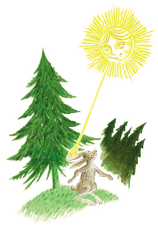 В ту же минуту зайчик почувствовал, как что-то тёплое коснулось его ушка. Словно на него скатилась с листика рябинки, росшей рядом, нагретая солнышком капелька росы. Но то была не росинка. Это тонкий солнечный лучик пробежал вдоль заячьего ушка, и шёрстка на нём, обычная серая шёрстка, стала нежно-золотистой. И, самое интересное, цвет этот не изменился и после того, как солнышко спряталось за густую крону высокой сосны.