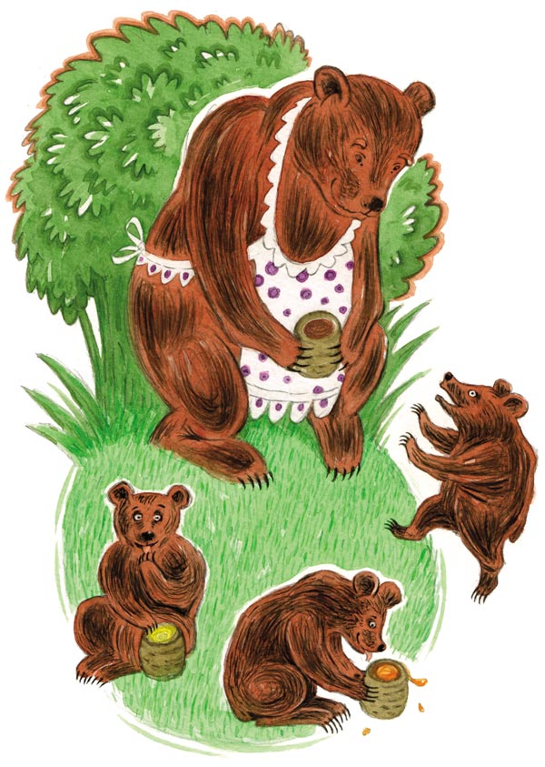 Рыжий ведмежонок и прибегает. А Серый и Чёрный понимают, что не их это черёд, что им медку попозже дадут, – и не бегут, слушаются мамушку-ведмедушку.