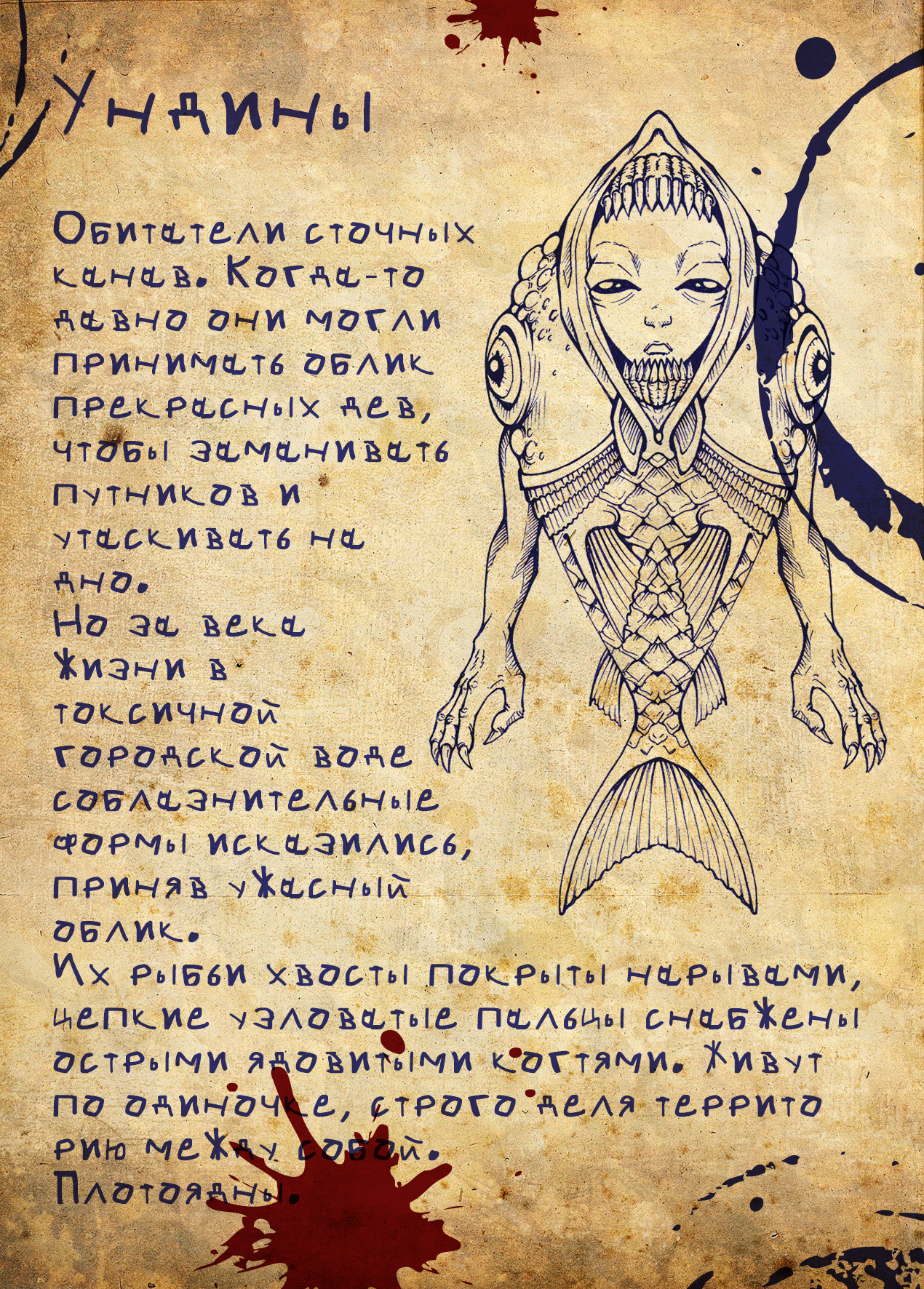 «Ундины – обитатели сточных канав. Когда-то давно они могли принимать облик прекрасных дев, чтобы заманивать путников и утаскивать на дно. Но за века жизни в токсичной городской воде соблазнительные формы исказились, приняв ужасный облик. Их рыбьи хвосты покрыты нарывами, цепкие узловатые пальцы снабжены острыми ядовитыми когтями. Живут по одиночке, строго деля территорию между собой. Плотоядны», – с трудом разобрал Игорь.