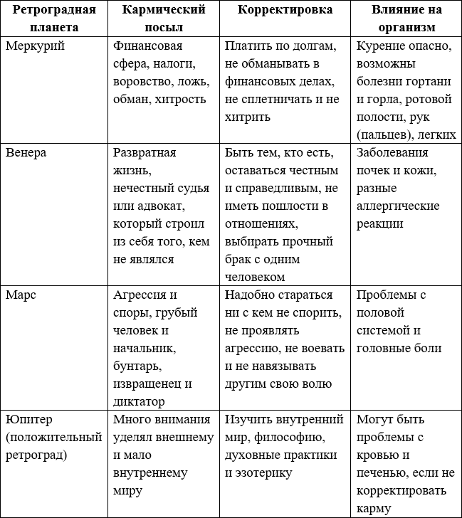 На кармические долги указывают ретроградные планеты в астрологической карте (ретро – обратное движение планеты). Обозначаются они красным цветом с буквой «R». По энергии планеты можно определить, какой именно долг ждет человека. Например, если в карте есть ретроградный Юпитер, тогда долг – изучить внутренний мир, науку философии и духовности, посвятить жизнь уединению и смирению. Также кармический посыл зависит от положения ретро планеты в астрологической карте. Солнце и Луна ретроградными быть не могут.