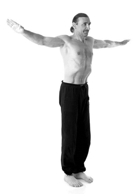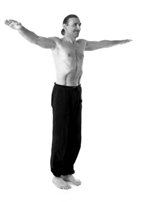 3 Продолжайте медленный и глубокий вдох, одновременно плавно поднимая руки (ладони обращены вниз) через стороны – это позволит вдыхаемому воздуху заполнить верхний отдел легких.