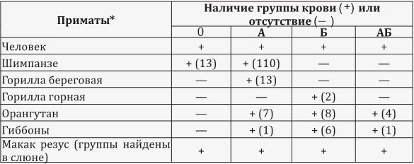Сделанные Ж. Труазье (1931 г.) неоднократные переливания крови от разных шимпанзе группы II (А) людям той же группы прошли вполне успешно, без каких-либо отрицательных явлений. Гораздо раньше, век назад, не менее успешными были произведенные Г. Фриденталем (Friedenthal, 1900 г.) опыты переливания человеческой крови в кровеносную систему шимпанзе. В то же время при опытах на низших обезьянах оказалось, что, судя по красноватому цвету мочи, человеческие эритроциты испытали в крови этих обезьян гемолиз: следовательно, кровь человека оказалась для низших обезьян чужеродной. Такое мнение подтвердилось при помещении цельной крови павиана в сыворотку человеческой крови – эритроциты обезьяны разрушались. При подобном же опыте с цельной кровью шимпанзе ее эритроциты оставались в сыворотке человеческой крови без изменений.