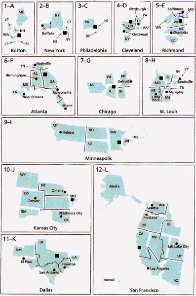 ФРБ (всего их 12) и их филиалы выполняют основные функции ЦБ на своей территории. Они выдают кредиты коммерческим банкам-членам, хранят их обязательные резервы, осуществляют межбанковские расчеты и др. Границы ФРБ часто не совпадают с границами штатов, но составлены с учетом границ сложившихся социально-экономических районов США, см. рисунок. Расположение самих ФРБ также обычно соответствует центральным городам таких районов. Например, в самостоятельные ФРБ выделены территории Новой Англии (ФРБ Бостона), Нью-Йоркского района (пригороды Нью-Йорка в штатах Коннектикут и Нью-Джерси отнесены к ФРБ Нью-Йорка), а также территории Филадельфийского района (ФРБ Филадельфии) и Старого Юга (вместе со Столичным районом, ФРБ Ричмонда). Еще более очевидно совпадение многих социально-экономических районов и их центров с расположением и границами филиалов ФРБ. Например, легко узнаются Питтсбургская Пенсильвания (филиал в Питтсбурге), Флорида (Майами), Мексамерика (Сан-Антонио), Центральный Техас (Даллас), Мормонский Запад (Солт-Лейк-Сити), Северная и Южная Калифорния (Сан-Франциско и Лос-Анджелес) и т. д. Название и границы социально-экономических районов США приводятся по книге Л. В. Смирнягина «Районы США: портрет современной Америки» [10].